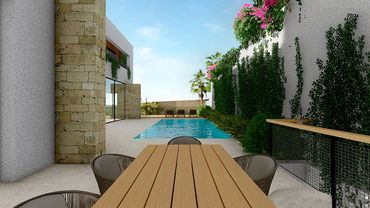 The idea with these properties is to find a timeless and at the same time contemporary design, which is straightforward and clean, but by no means appears cold or too purist. This is why Mediterranean materials such as natural stone and the wood elements are used for the facade and interior.